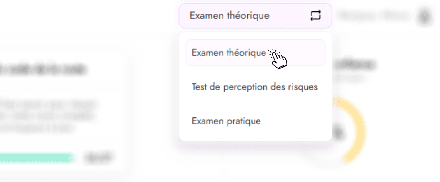 3. Depuis le tableau de bord, utilise le sélecteur en haut pour choisir la préparation que tu veux commencer (Examen théorique, Test de perception des risques, Examen pratique…).